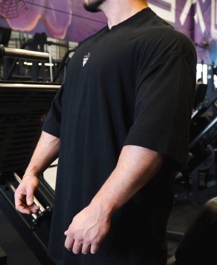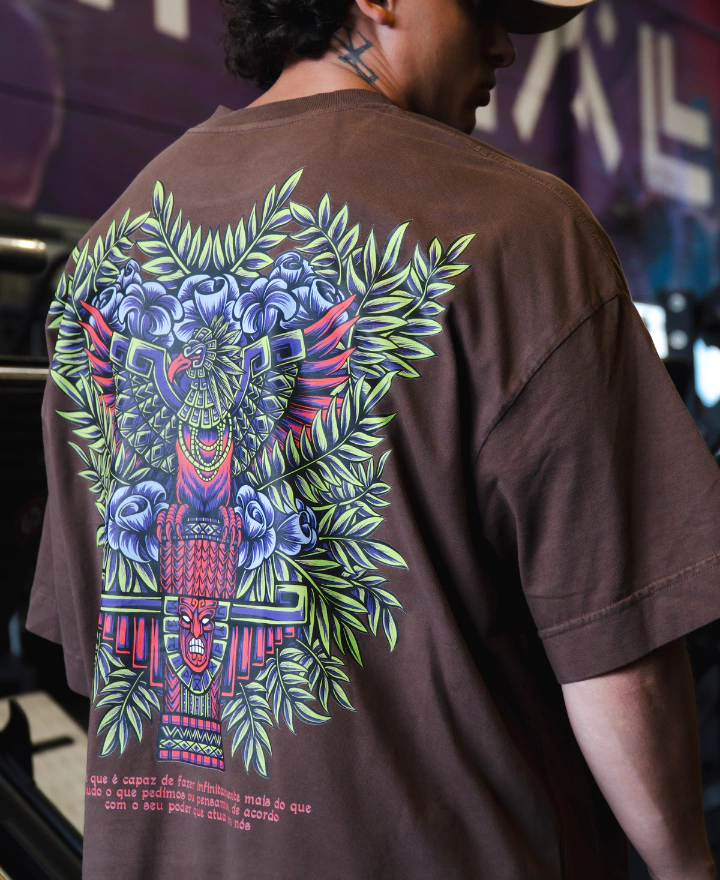 Modelagem oversized no formato quadrada, trazendo um caimento fora do comum, um produto com medidas maiores na largura de corpo e mangas.